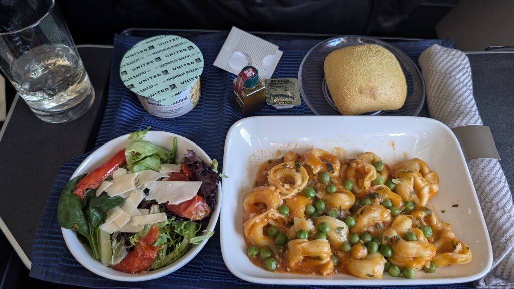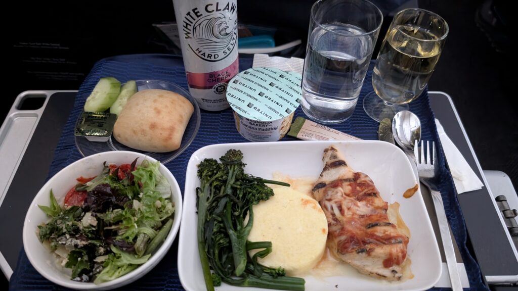You get free booze and an actually decently comfy seat in United First, and since our flight was over 900 miles, we got lunch both directions.